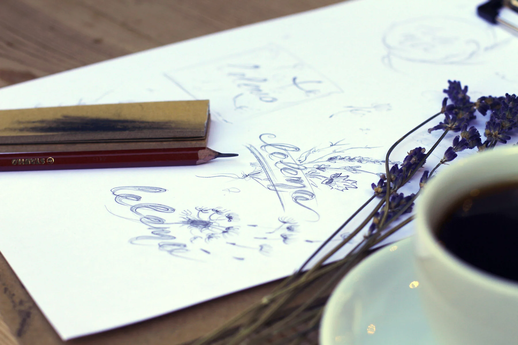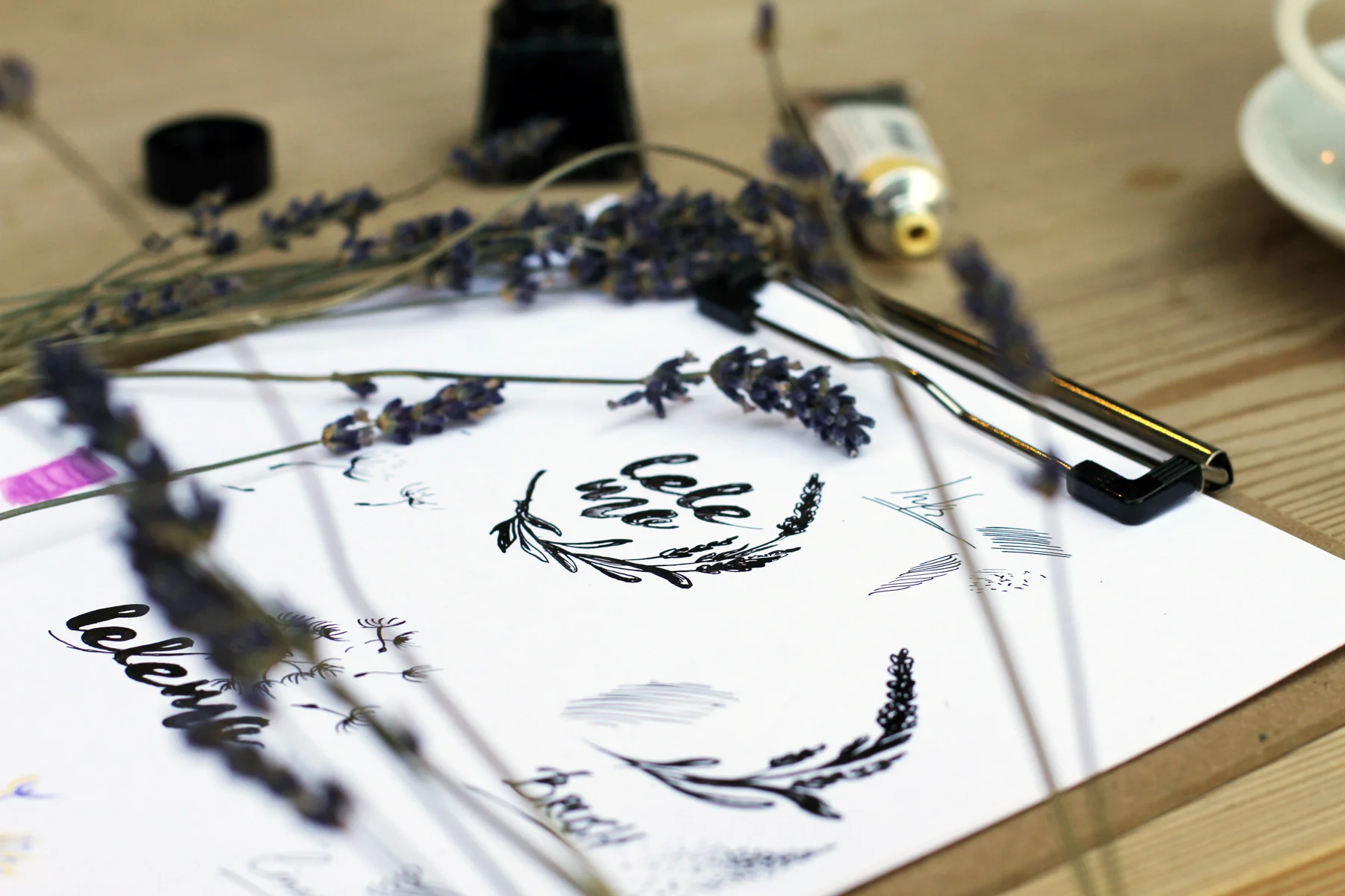 I decided to show it “in the field”—logotype project for a small business company called Lelemo (natural handmade souvenirs). Lavender was an inspirational symbol and I started with pencil sketches directly on Bristol paper (while instantly inhaling the fresh lavender flowers aroma)
