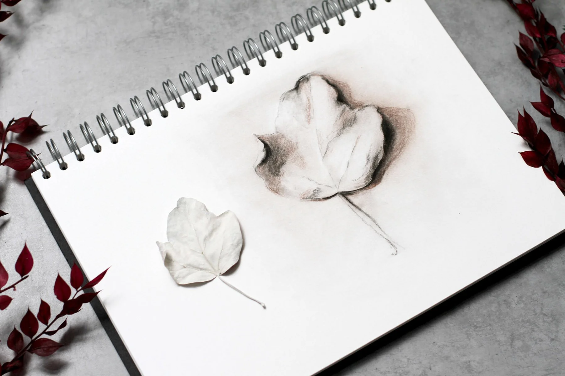 I’ve included all the sketches to save time if you want to follow along with my examples. We’ll begin with a Leaf Study and then create a Vintage Postcard, Shiny Ladybug, Decor Apple and a Pomegranate.